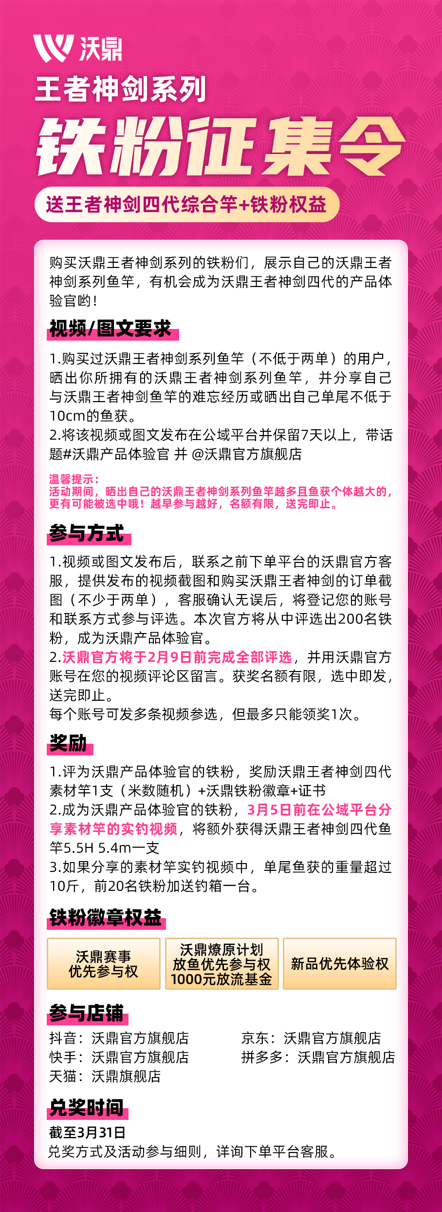 hello钓友们 相信大家都已经有所耳闻 王者神剑四代综合竿即将问世 晒装备 秀鱼获 共话垂钓江湖往事 赢取新神器 【王者神剑四代综合竿】率先尝鲜资格! 王者神剑的铁粉们快看过来!!! 钓友们注意啦 以上铁粉活动需在公域平台参与哦~ (抖音、快手、视频号等平台) 即日起即可参与 2月9日前沃鼎官方会评选出200名铁粉 送出王者神剑四代综合竿素材竿 及拥有3大权益的沃鼎铁粉徽章 这200名铁粉收到素材竿后发布素材竿实钓视频 即可参与2月9日-3月5日的成品尝鲜活动 获得王者神剑四代综合竿5.5H 5.4m成品 还有机会获得钓箱加赠礼哦~ 🎁🎁🎁 本次活动名额有限 看到这条内容的铁粉们 还有哪些细则没有参透 可以联系自己下单平台的客服哦~ 我们的客服小姐姐将会一一解答 沃鼎王者神剑系列的铁粉们 速速行动起来吧!