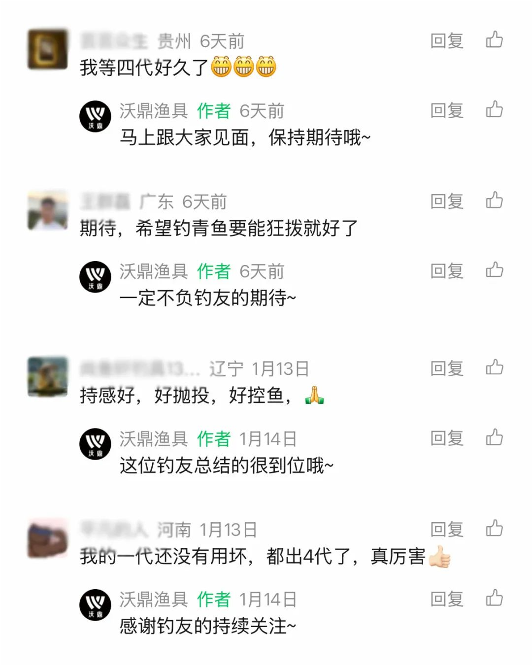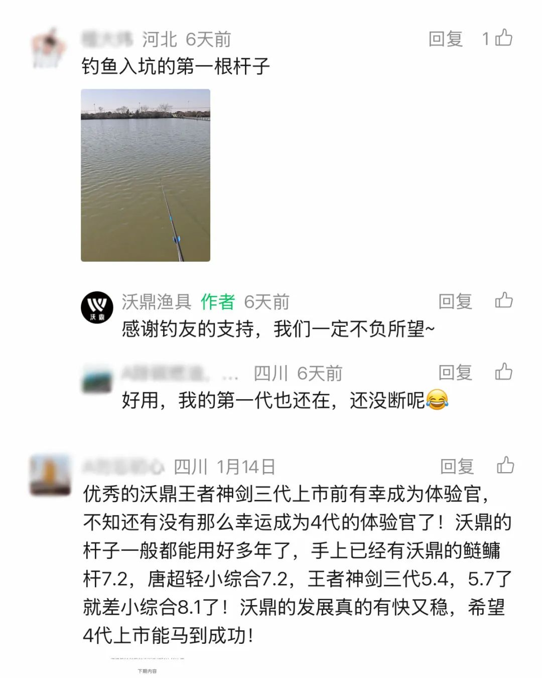 hello钓友们 前几期为大家分享了一些 王者神剑四代综合竿的新品信息 钓友们在评论区纷纷表达了 对这款竿子的期待以及对沃鼎产品的支持 本期内容 小编将继续为钓友们分享 来自沃鼎产品体验官的 新品6.5H7.2m素材竿实钓 看看这次它的表现如何 是否符合钓友们的期待呢~ 在初步上手阶段 王者神剑四代综合竿自重、锥度 就到了产品体验官的认可 自重轻、锥度小、持感轻盈 也是四代主要升级的亮点 实钓视频中可见 较小的锥度设计使得 竿子力量传导相当清晰 中鱼的瞬间将信号 从竿稍传递到手把节 使得作钓者可以迅速扬竿刺鱼 抓住稍纵即逝的鱼口 纵享一击即中的掌控感 控鱼遛鱼时的表现也很亮眼 在刺鱼成功后 第一只体型稍小的草鱼 基本一只手就可以遛到岸边 遛鱼回鱼都非常的轻松 而应对体型稍大的青鱼时 鱼竿一二节硬度表现较强 中段硬挺 弧度过渡自然 每一个竿节都能实现很好的卸力 强悍的腰力和硬度保障 良好的回弹和韧性加持 让作钓者轻松遛鱼 快速回鱼 十几斤的大青也在短时间内拿下! 此竿在手 让你每逢出钓都能掌控全场 痛快连竿、满载而归! 怎么样钓友们 这次王者神剑四代综合竿的表现 有没有超乎你们的期待呢? 1月25日 这款新品也将亮相 沃鼎2026新品发布会现场 钓友们记得关注线上直播 一睹新品风采哦~