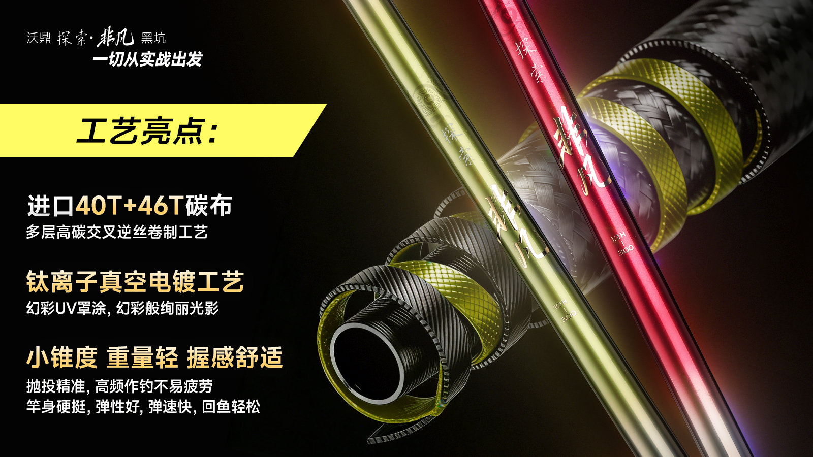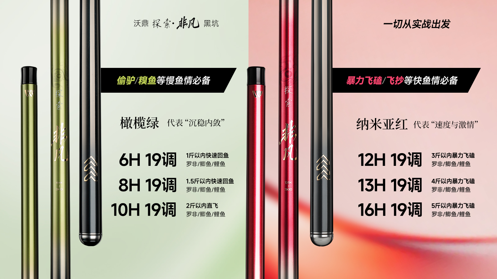 hello钓友们 还记得发布会上那部 探索非凡 黑坑竿的宣传片吗? 裴裴老师暴力飞磕的身影是不是又飒又帅 黑坑竿的表现是不是让人眼前一亮又一亮 反正小编是彻底被圈粉了! 本期内容小编就带大家重温一下 那些充满速度与激情的闪光瞬间 再度感受黑坑作钓的非凡时刻 探索非凡 黑坑竿 由沃鼎与国家三级竞钓大师 罗非女王张裴裴实战联合开发 裴裴老师历时超过一年时间 展开了上千场黑坑实战测试 将每一次作钓都转化为精准数据 沃鼎研发团队依此反复调校 最终成就了这款性能强悍的黑坑利器 钓友们都知道 好的性能表现和数据 离不开优秀的原料和制作工艺 探索非凡 黑坑竿 采用进口40T+46T碳布打造 多层高碳交叉逆丝卷制工艺 小锥度、重量轻、握感舒适 很适用于黑坑高频作钓 6H/8H/10H/12H/13H/16H 六个硬度 攻守自如 调性设计均为19调 黑坑、休闲、水库、野钓、竞技都适用 让你在瞬息万变的黑坑鱼情中 始终领先一步 6H/8H/10H 以橄榄绿为主色调 代表“沉稳内敛” 适合在慢鱼、黑坑偷驴、摸鱼、糗鱼 等需要精细作钓的场景下 钓罗非/鲫鱼/鲤鱼 用实力助你锁定每一尾珍贵渔获 6H 1斤以内快速回鱼 8H 1.5斤以内快速回鱼 10H 2斤以内可直飞 面对快-慢转折的中后期鱼情 这三个硬度 能很好地应对不同的鱼速和个体搭配 控鱼稳、回鱼快 护线又黏鱼 黑坑上岸有保障 12H/13H/16H 以纳米亚红为主色调 代表“速度与激情” 专为黑坑中快鱼、暴力飞抄、飞磕 等进攻性钓法而生 适合在此类场景下作钓罗非/鲫鱼/鲤鱼 让你在争分夺秒的抢鱼中占据上风 12H 3斤以内暴力飞磕 13H 4斤以内暴力飞磕 16H 5斤以内暴力飞磕 面对快节奏的鱼情 这几个硬度的竿子能做到 整个竿身的每一个竿节都充分卸力 竿身受力均匀、弧度表现更好 省力、卸力、舒适的同时更加护线 面对小罗非的暴力飞磕 大罗非的快速抢鱼 都能应对自如 探索不凡 黑坑竿 将于3月6日11:00 在天津春展新品首发 感兴趣的钓友记得提前预约 届时裴裴老师也会来到现场 为大家分享实测经验 想要一睹探索新品黑坑竿风采的钓友 不要错过哦~
