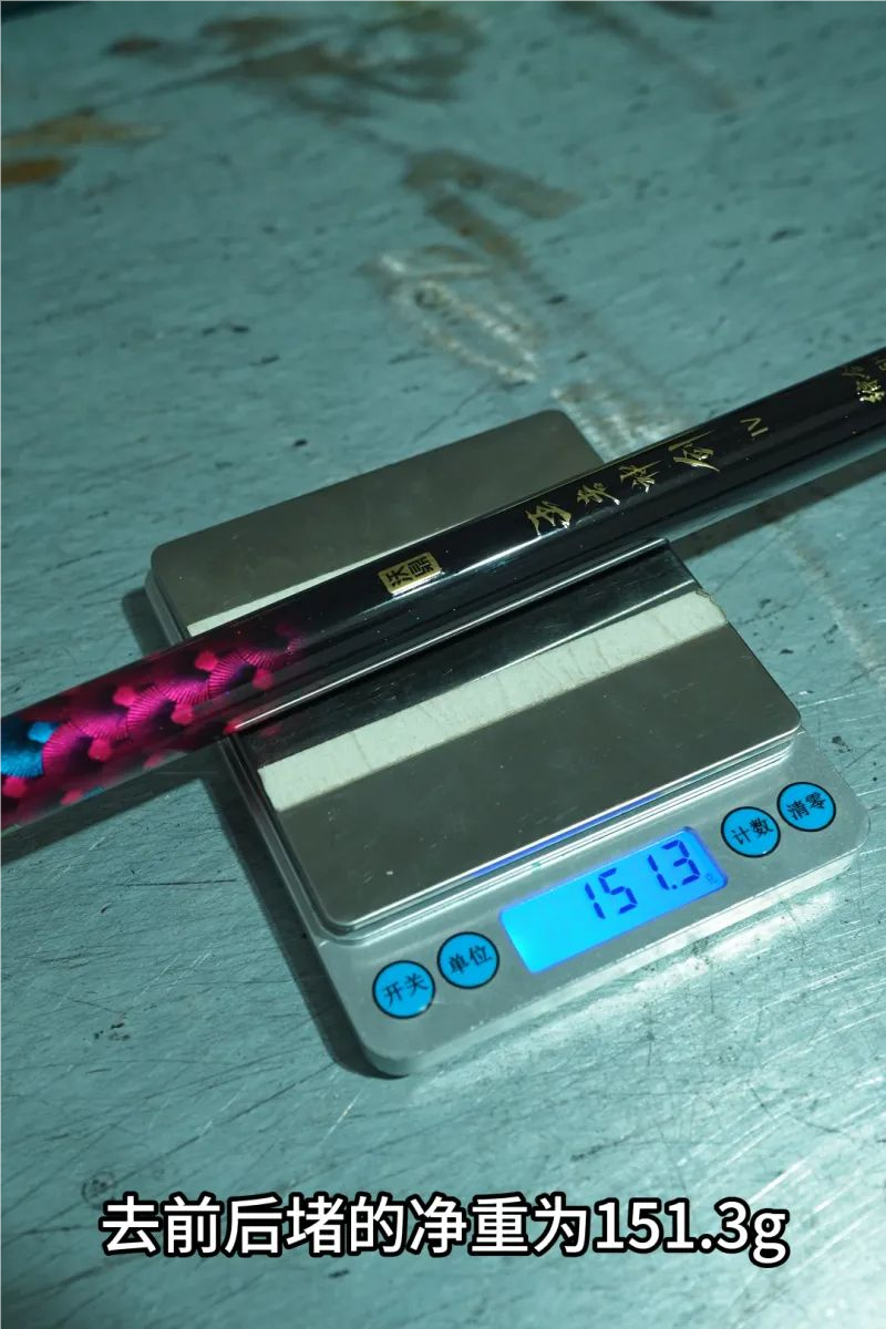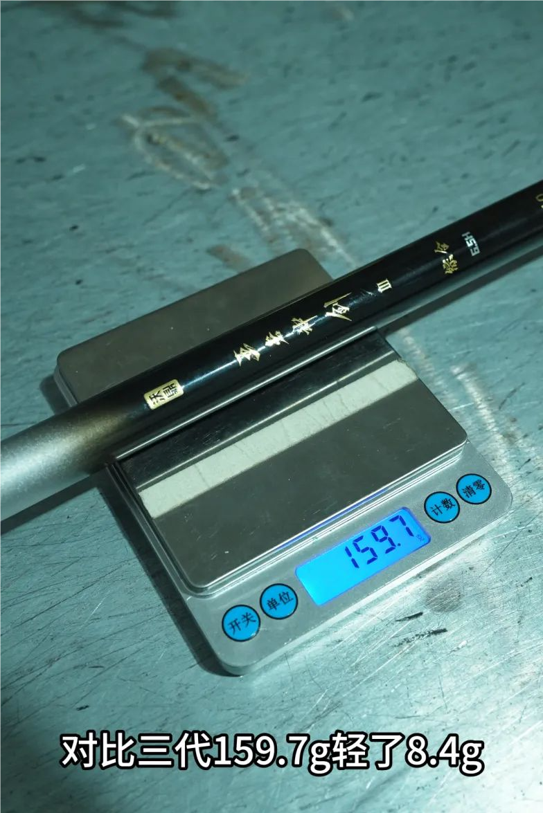 平时喜欢钓中大型鱼种、抽鲢鳙的钓友们,看过来!到你们的主场啦~ 本期内容,小编将为大家奉上王者神剑四代6.5H5.4m的重量、锥度、调性、钓重等参数的升级实测。6.5H的升级点在哪里呢?一起来揭秘! 净重揭秘 重量实测: ■ 王者神剑四代6.5H 5.4m去前后堵净重:151.3g ■ 王者神剑三代6.5H 5.4m去前后堵净重:159.7g 实测可见,王者神剑四代6.5H5.4m相较三代6.5H5.4m轻了8.4g,重量大幅减轻,实际作钓时应对频繁、快速的抛投及扬竿动作时也将更加省力灵活。 锥度实测 前后元径实测: ■ 前元径:17.64mm ■ 后元径:22.44mm ■ 竿稍先径实测:1.55mm 王者神剑三代6.5H5.4m的先径为1.4mm,四代6.5H5.4m升级后在先径上做了加粗设计,在提高抛投指向性的基础上还能兼顾抽鲢鳙。堪称征战大水面、挑战鲢鳙等鱼种的可靠利器。 调性测试 ■ 调性:19调 抖动鱼竿可以发现,王者神剑四代6.5H是标准的19调性。空竿状态下仅竿稍前端可见灵敏的颤动,中后段没有多余的晃动,展现出了很好的的稳定性与一体感。 重心实测 ■ 5.4m带后堵重心:155cm 实测结果重心相对靠后,实际作钓时的握持感也会比较舒适,为钓友们提供畅快的垂钓体验。 45°挂砝码扬竿 硬度+回弹力实测: 200g的钓重下竿子前端回弹表现非常不错,一节比较硬挺。实际作钓时控鱼、回鱼的体验感以及整个作钓过程中的手感都会有所提升。 腰力实测 ■ 砝码:1000g ■ 砝码:1500g 实测可见,在1000g及1500g钓重下,竿子腰力表现均非常强悍。整竿都能充分且均匀的参与受力,形成一道饱满而稳定的弧线,无僵硬死角。面对大物时,能为钓友们提供源源不断的回拉信心。 钓重实力 钓重实测: ■ 成功钓起:3900g 达到了3300g-3900g的设计钓重范围,在重量减轻的基础上钓重相较三代有所增加。实际作钓时可以应对60斤以内的鲫鱼/鲤鱼/鳊鱼/翘嘴/草鱼/鲢鳙/青鱼。 以上就是王者神剑6.5H5.4m的实测内容啦,想要抽鲢鳙、钓大物的钓友们不要错过这一款!3月6日10:00即将在天津春展首发,敬请期待!