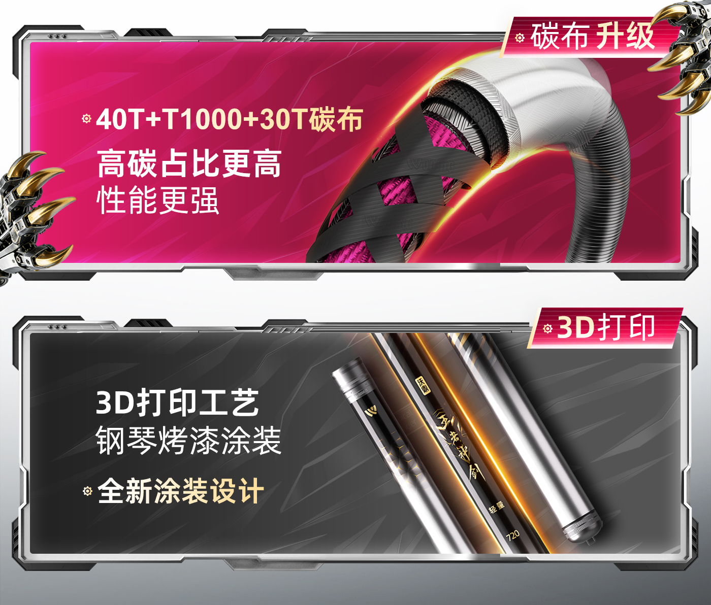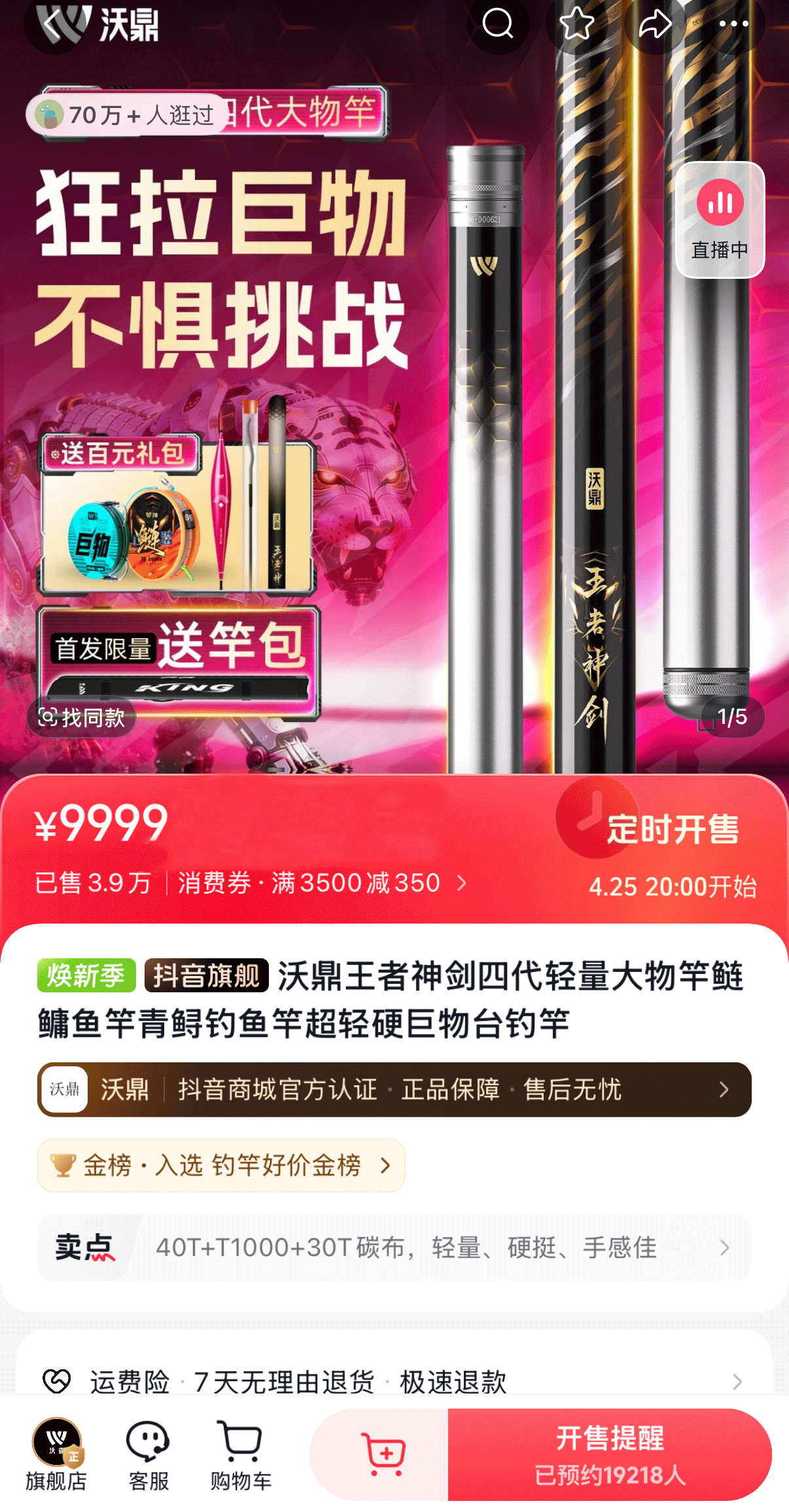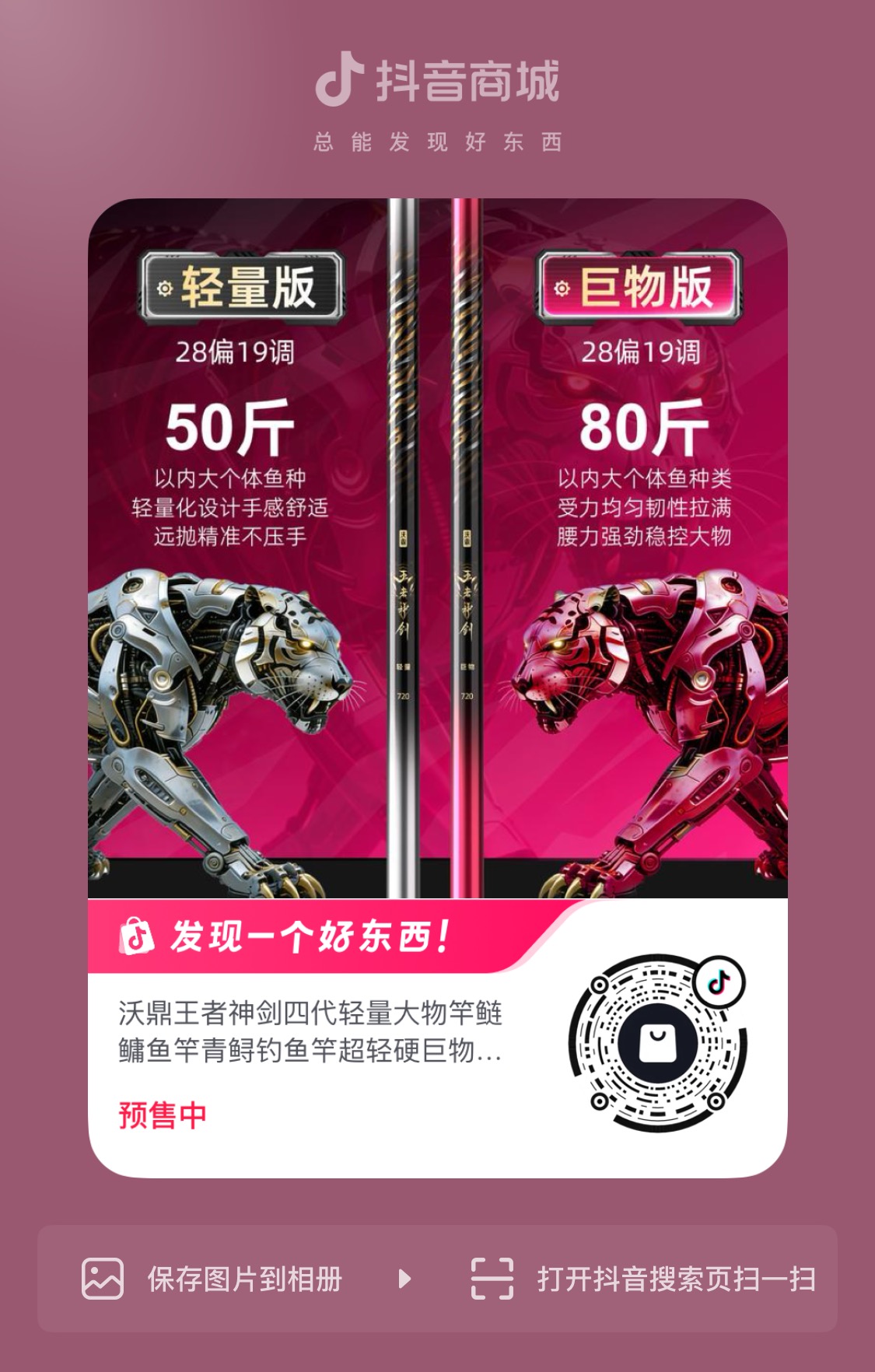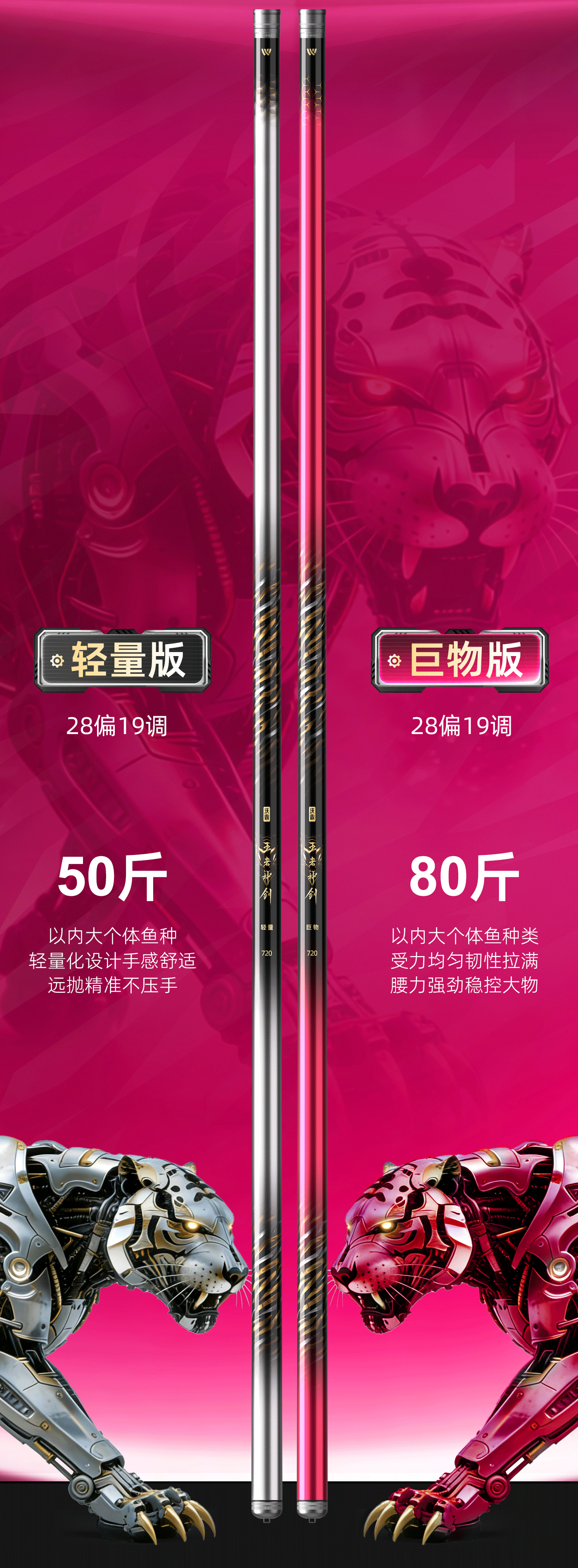 hello钓友们 沃鼎王者神剑四代大物竿 还有十天就要跟大家见面啦! 新品预约一开启 热度直线飙升 截至4月15日14:00 抖音【沃鼎官方旗舰店】 已有近20000位钓友预约 期待值已然拉满 本期内容为钓友们带来 王者神剑四代大物竿涂装概念视频 为您揭秘这款“大物利器“”的灵感来源 王者神剑四代大物竿 无边混沌的黑暗被骤然撕裂 周身流窜金色电流的机械猛虎 带着雷霆万钧的威势踏空而来 虎目如炬,威震八荒 虎啸冲天,穿云裂石 顷刻间 自带威压的机械猛虎 将一身雷霆与傲骨尽数收敛 俯首融入竿身 化作竿身元素 王者神剑四代大物竿应运而生 王者神剑四代大物竿 以【机械虎】为主题 将野性生命力与未来科技感结合 这与大物垂钓的精髓不谋而合 大物守钓时如虎卧山岗般沉稳静谧 中鱼时如猛虎下山 爆发出摧枯拉朽的力量 机械感则代表精密工艺 硬核性能与科技迭代 呼应沃鼎持续升级的碳布原料与工艺 轻量版以暖枪银为主色调 如银枪破风而出般 锐利、轻盈且不失优雅 恰似轻量版本身 举重若轻,却锋芒毕露 竿子的轻量化设计 并非追求极致的暴力输出 而是追求一种“举重若轻”的从容 确保作钓者在长时间作钓、高频次抛投时 仍能保持舒适的手感与充沛的体力 巨物版以魅焰红为主色调 如燃烧的烈焰般炽热夺目 热烈而强悍 呼应钓鱼人直面巨物时 一往无前的勇气与魄力 巨物版强化后的腰力 如同蓄满能量的弓弦 无论巨物如何蛮横冲撞 都能以强悍腰身将其牢牢锁住 实现碾压级对抗 沃鼎王者神剑四代大物竿 匠心设计 颜值更能打 40T+T1000+30T高碳打造 性能升级 实力更强悍 4月25日20:00首发 还没预约的钓友们速速加入“预约大军” 与近两万位钓友一起 共同期待新品的首发吧~